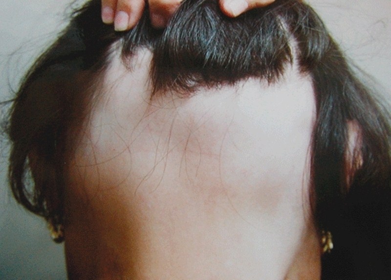 - Тракционна алопеция (при трихотиломания или много стегнати плитки) - наблюдава се при, хора страдащи от трихотиломания. Трихотиломанията е заболяване , което е свързано с неконтролируемо желание за скубане на косми от тялото. Тракционната алопеция може да се причини и от прекалено стегнати плитки.